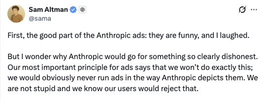 오픈AI가 챗GPT에 광고를 도입하겠다고 발표한 소식에 대한 앤트로픽의 ‘돌려까기’로 보여지는데요. 이 광고를 본 샘 올트먼은 트위터에서 강하게 불쾌함을 드러냈습니다. 올트먼의 트윗을 볼까요?