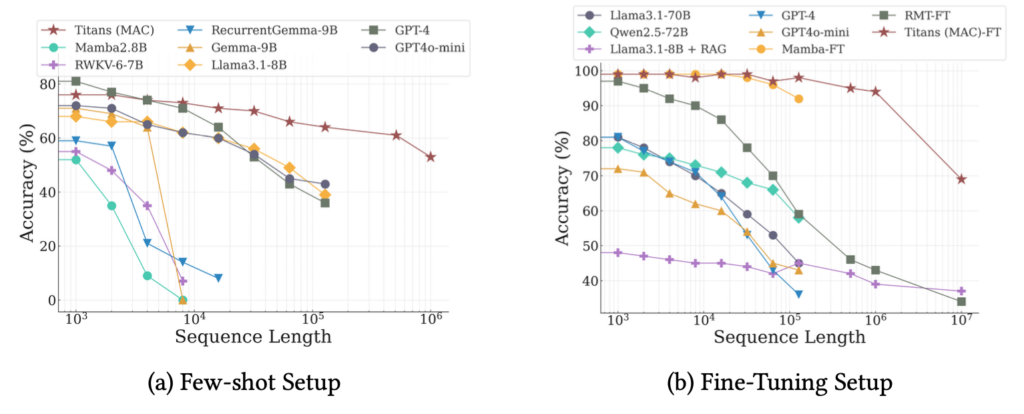 NIAH 테스트 결과. 문맥이 길어질수록(가로축) 다른 모델들의 성능은 급락하지만, Titans(MAC)는 안정적인 정확도를 유지한다. 출처: 구글.