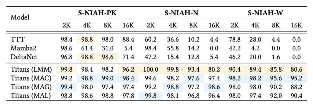 위 테이블을 보면, Mamba2는 문서 길이가 길어지자(4K) 정확도가 61.4%로 뚝 떨어졌으며, 8K 구간에서는 31.0%까지 하락했습니다. 반면 Titans (LMM)는 Mamba2가 31.0% 정확도를 기록할 때도 98.2%를 유지했지요.