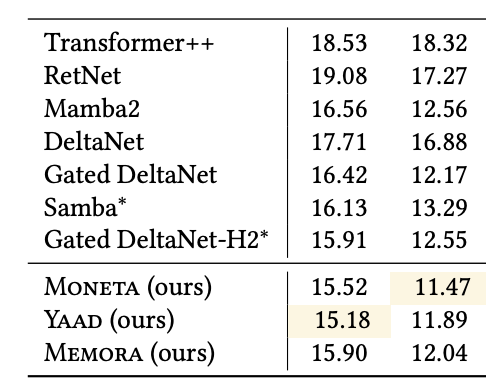 Transformer++는 18.53, 기존 표준 모델인 Mamba2는 16.56을 기록할 때 연구진의 YAAD는 15.18을 기록했습니다. 수치상, YAAD가 훨씬 적은 메모리 용량을 사용하면서도 Transformer++보다 더 똑똑하게 언어를 이해했다는 것을 의미하지요.