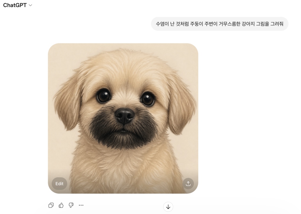 누군가로부터 '수염이 난 것처럼 주둥이 주변이 거무스름한 강아지 그림을 그려줘'라는 요청을 받았다고 상상해 보겠습니다.
