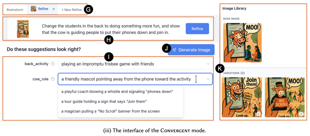 HAICo의 인터페이스는 아이디어를 넓게 탐색하는 Divergent mode와, 선택한 이미지를 구체적으로 다듬는 Convergent mode로 나뉩니다. 전자 모드에서 사용자가 프롬프트를 입력하면 시스템이 제목, 썸네일, 설명, 배경 정보, 카테고리 태그를 포함한 아이디어 카드를 제안하고, 필요하면 추가 아이디어를 받거나 직접 새 아이디어를 만들 수 있습니다. 후자 모드에서는 사용자가 수정 의도를 입력하면 시스템이 이를 조정 가능한 항목과 옵션으로 풀어 제시하고, 이를 바탕으로 새로운 이미지 변형을 생성합니다. 'K'의 이미지 라이브러리는 초기 이미지와 정교화된 변형들을 함께 보여주어, 여러 방향을 비교하며 작업을 이어갈 수 있게 합니다. 결과는 어땠을까요?