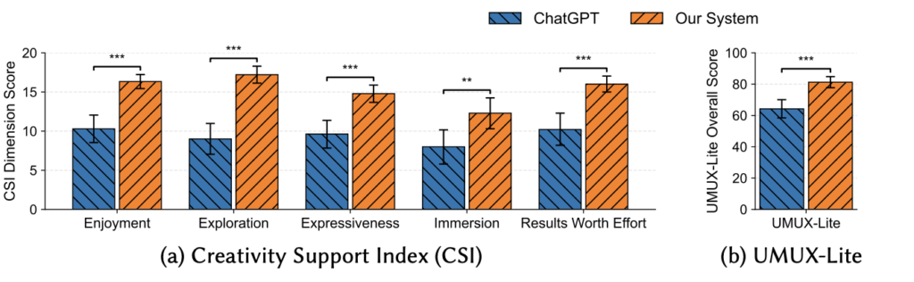 실제 실험 결과에서도 이러한 경향은 일관되게 나타났는데요. HAICo는 사용자가 느끼는 창작 경험을 평가하는 지표인 Creativity Support Index(CSI) 전반에서 더 높은 점수를 기록했으며, 시스템 사용성을 평가하는 UMUX-Lite에서 역시 81.25 대 64.24로 더 높게 나타났습니다.